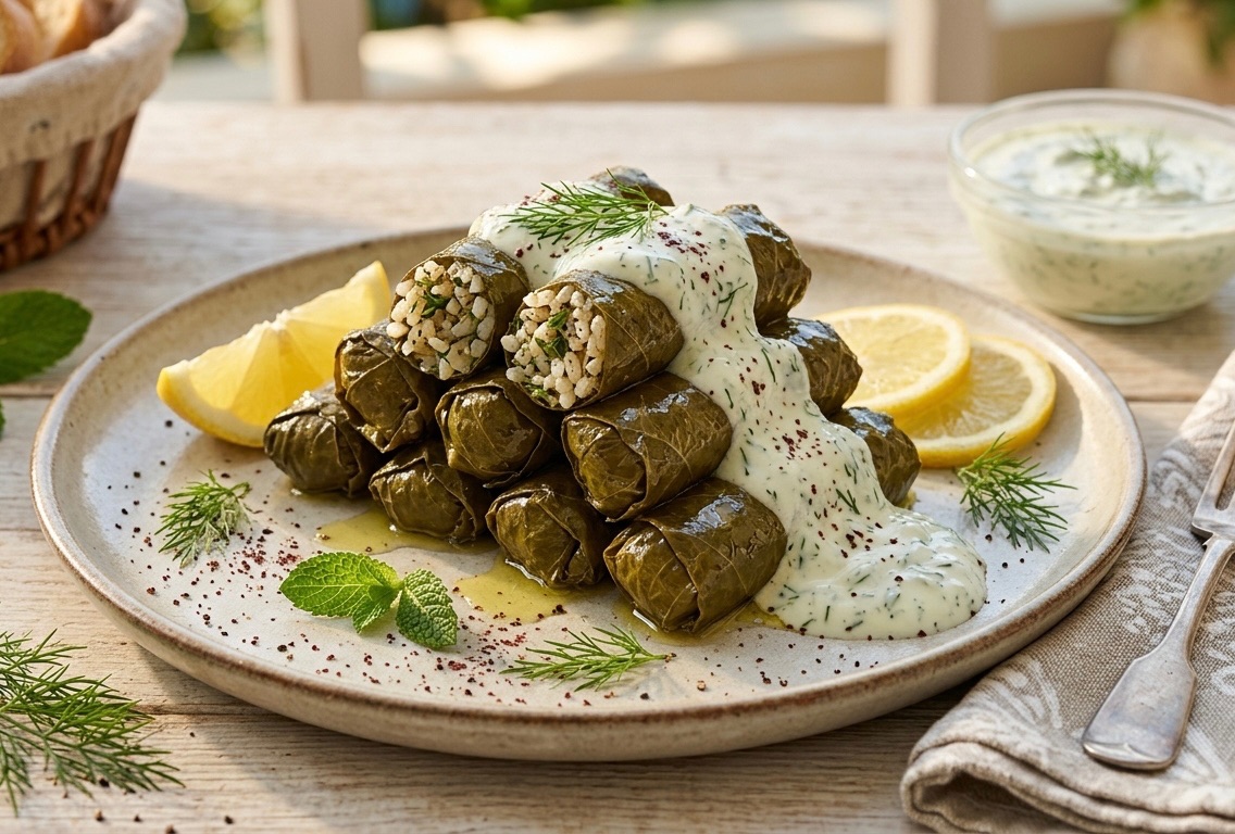 Serve: Carefully remove the plate and arrange the stuffed grape leaves on a serving platter. Serve warm or at room temperature with the creamy dill yogurt sauce on the side.