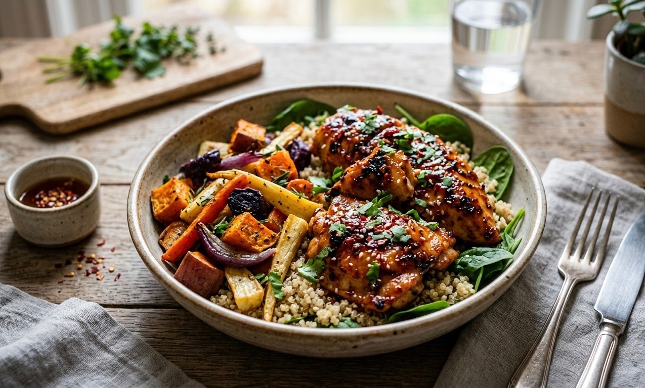 Elevate your weeknight meals with these vibrant bowls featuring tender, oven-roasted chicken coated in a sweet and spicy honey glaze. Paired with caramelized root vegetables and a refreshing citrus slaw, this dish offers a perfect balance of flavors and textures for a satisfying and wholesome dinner.