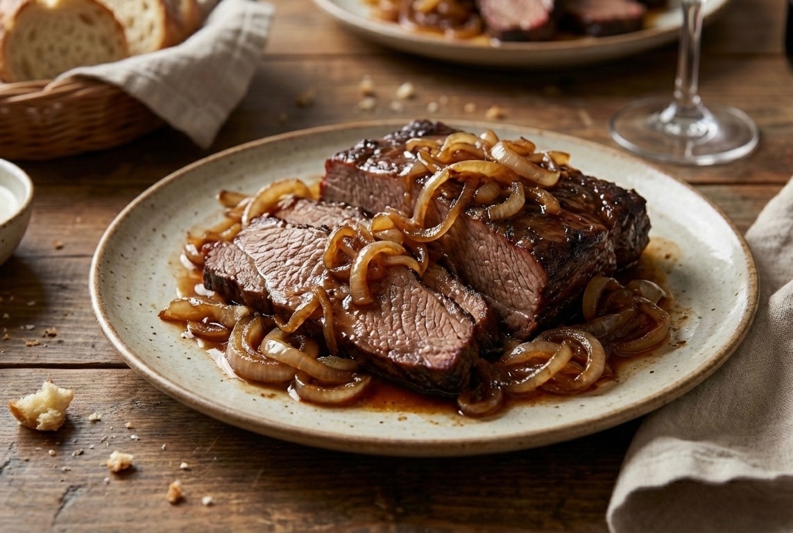 Slow-Cooked Balsamic-Glazed Beef Brisket with Caramelized Onions | Yumzy Recipes | YUMZY - AI Cooking Assistant
