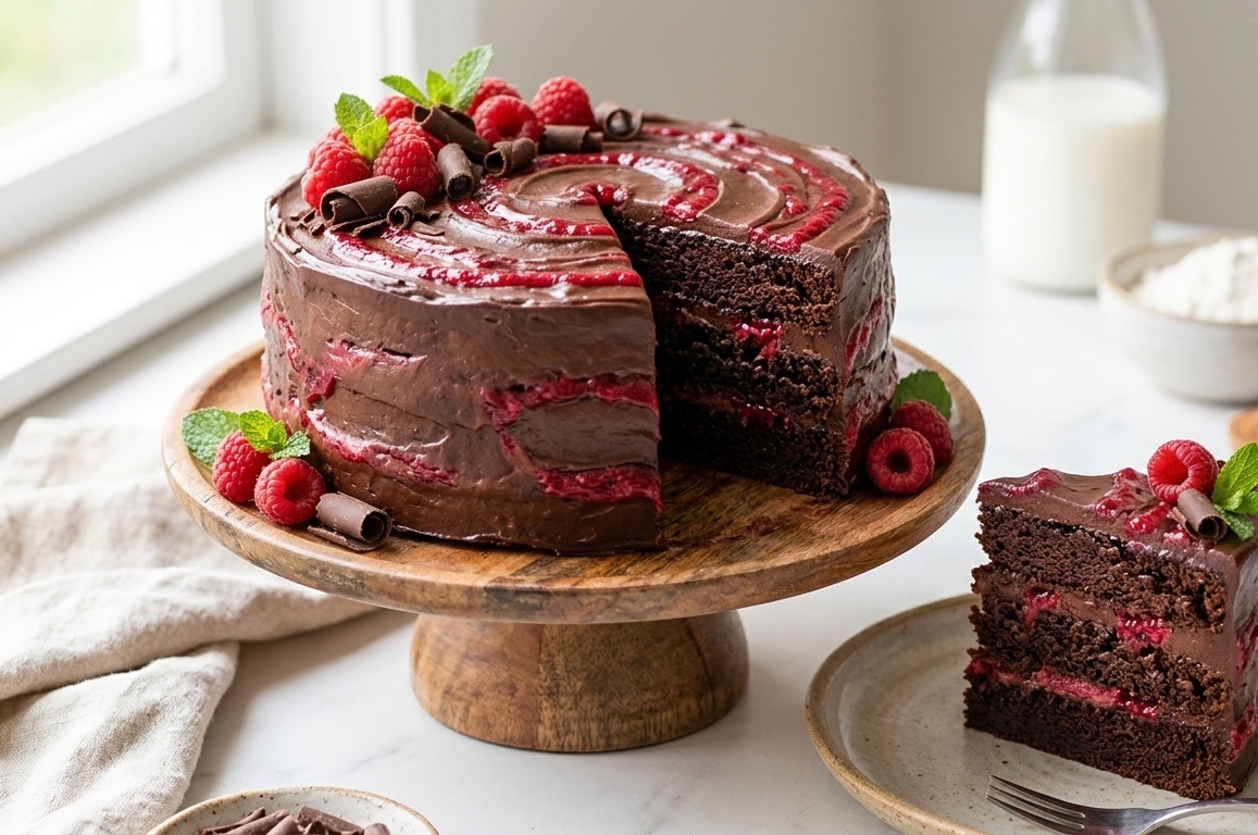 Once cakes are completely cool, place one layer on a serving plate. Spread a generous layer of chocolate frosting over the top. Dollop spoonfuls of the raspberry sauce over the frosting and gently swirl it in with a knife or skewer.
